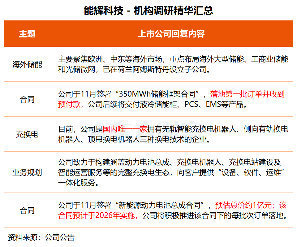 能辉科技近日接受西部证券两位分析师调研,公司在调研中表示,海外储能市场已取得战略突破和项目落地。公司于2025年11月签署“350MWh储能框架合同”,落地第一批订单并收到预付款,后续将交付液冷储能柜、PCS、EMS等产品。
