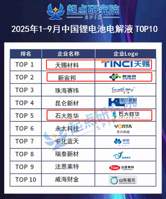 据起点研究院SPIR数据显示,今年1-9月中国锂电池电解液出货量为145.6万吨,同比增长了53.1%。在排名前十的企业中,天赐材料、新宙邦、石大胜华均有入榜,分别位列第一、第二、第五。
