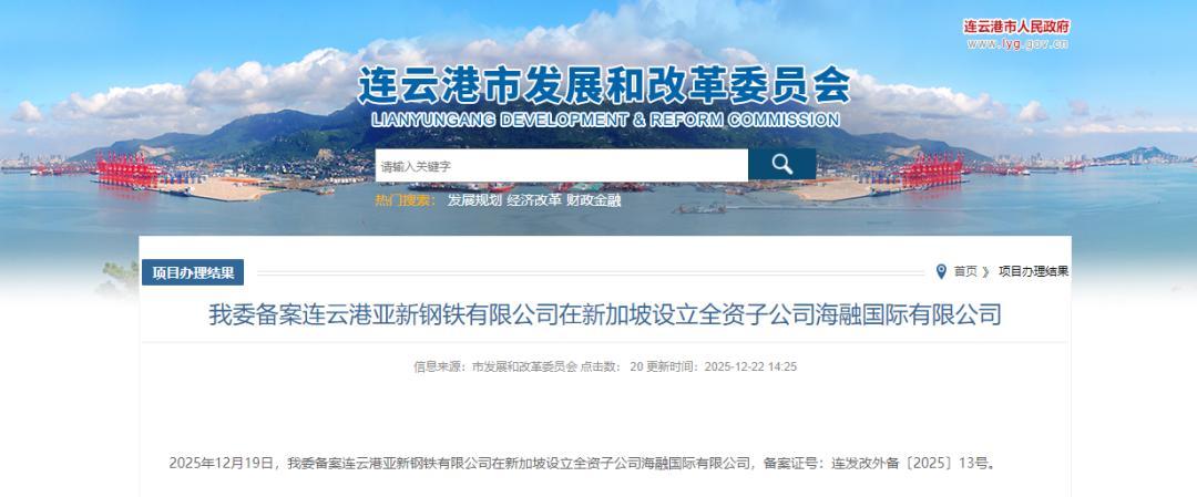 2025年12月19日,连云港市发展和改革委员会公开了一项项目管理结果,备案连云港亚新钢铁有限公司在新加坡设立全资子公司海融国际有限公司,备案证号:连发改外备〔2025〕13号,这标志着亚新钢铁国际化战略迈出了实质性的一步。