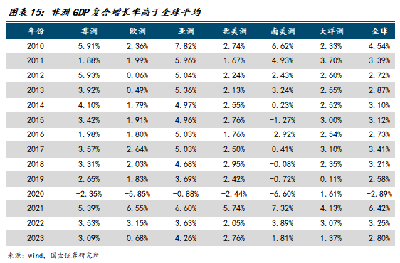 经济增速高于全球平均:非洲2010-2023年GDP复合增长率为3.55%,大于同期全球3.16%。国际货币基金组织在2025年10月《世界经济展望》中预计全球增速将由2024年的3.3%回落至2025年的3.2%和2026年的3.1%;相比之下,撒哈拉以南非洲2024年实际GDP增速为4.1%,并预计2025、2026年分别为4.1%、4.4%,持续跑赢全球同期水平。