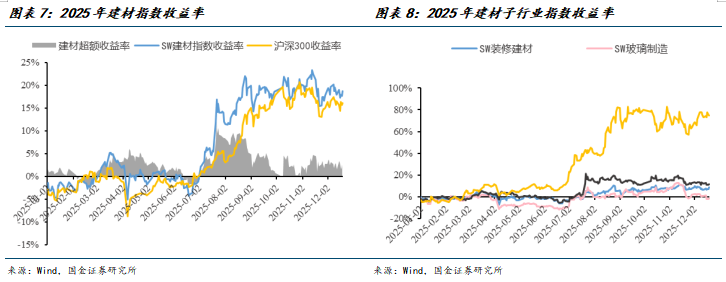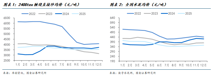 2025年结构性分化体现在:1)地产链相关的传统建材(如消费建材、水泥、玻璃)在需求偏弱背景下整体承压,收入同比下行;2)玻纤受益风电抢装、AI高景气等,成为2025年收入、利润增长最快的子板块。主因2025年建材两大内需双弱(地产+基建)。2025年1-11月商品房销售面积同比-8.6%,房屋新开工面积同比-20.6%,房屋竣工面积同比-18.1%,房屋施工面积同比-9.6%;2025年1-11月基础设施投资同比下降1.1%。因此,消费建材量价承压,玻璃价格和成本先后承压,水泥价格高开低走,低端玻纤盈利承压。