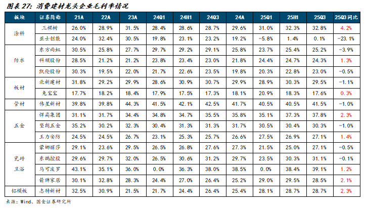 渠道和产品结构挑战同样助力Q3毛利率。25Q1-Q3三棵树、悍高集团、志特新材、箭牌家居、王力安防、科顺股份、马可波罗、兔宝宝毛利率分别同比提升4.2、2.3、2.3、2.1、1.4、1.3、1.2、0.3pct。