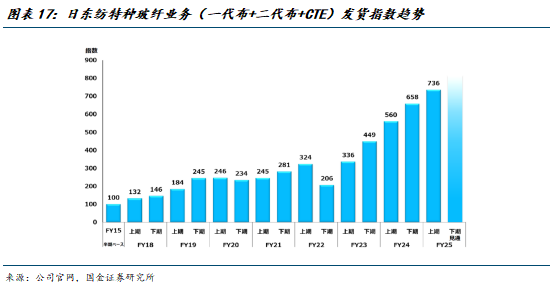 扩产规划更新:①日本基地:二代布(NER)于2025年开始量产,玻璃纤维三代布(NEZ)于2027-2028年左右开始量产。②中国台湾基地:一代布(NE)于25年3月已扩产,CTE布将于26-27年逐步扩产。