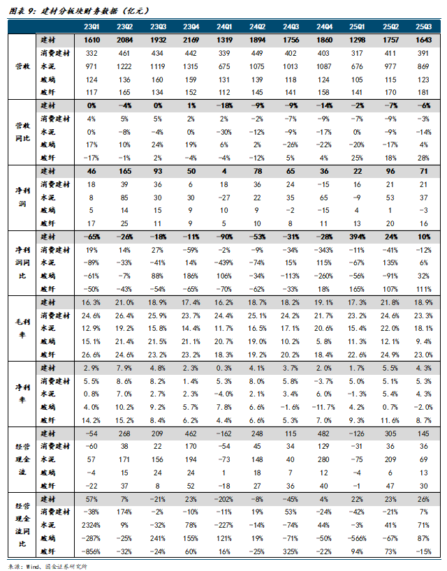 具体来看,玻纤2025Q1-Q3单季度分别实现营业收入141、170、181亿元,同比+25%、+18%、+28%,实现净利润13、20、16亿元,同比+165%、+107%、+111%。同期地产链建材(水泥、玻璃、消费建材)营收偏弱,2025Q1-Q3单季度同比变化范围为-20%至+4%,其中,水泥行业压力逐季增大,例如25Q2、25Q3单季度实现净利润53、37亿元,同比+135%、+6%,盈利同增幅度收窄。