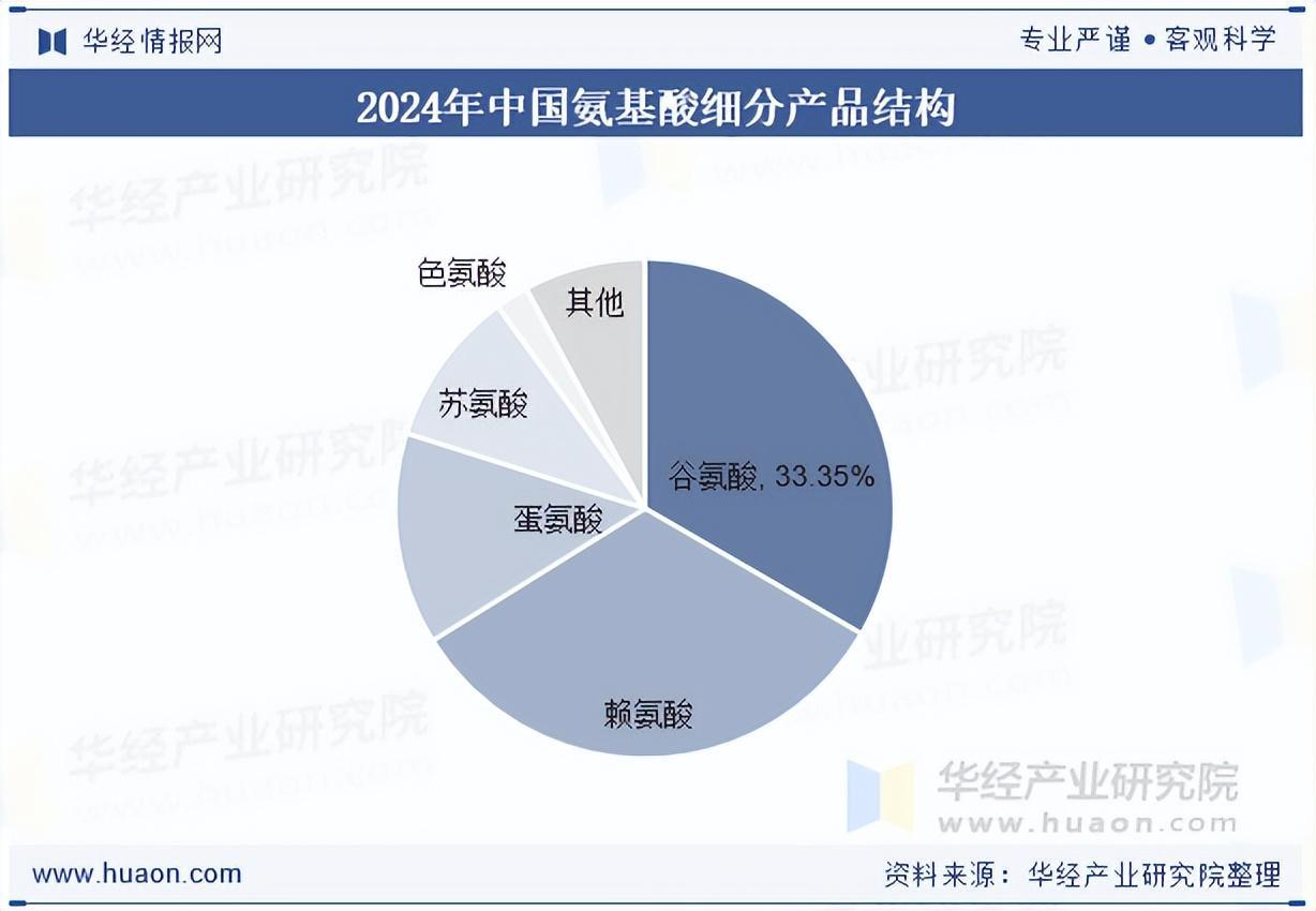 随着行业不断发展,氨基酸产品不断丰富,我国主要的氨基酸品种为谷氨酸、赖氨酸、蛋氨酸、苏氨酸和色氨酸等。其中,谷氨酸和赖氨酸占据主导地位。根据2024年的数据,谷氨酸和赖氨酸的市场规模占比分别达到了33.35%、32.79%。