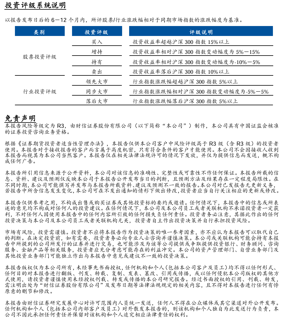 本订阅号不是财信证券研究报告的发布平台,所载内容均来自财信证券已正式发布的研究报告或对报告进行的跟踪与解读,订阅者若使用所载资料,有可能会因缺乏对完整报告的了解而对其中关键假设、评级、目标价等内容产生误解。提请订阅者参阅财信证券已发布的完整证券研究报告,仔细阅读其所附各项声明、信息披露事项及风险提示,关注相关的分析、预测能够成立的关键假设条件,关注投资评级和证券目标价格的预测时间周期,并准确理解投资评级的含义。