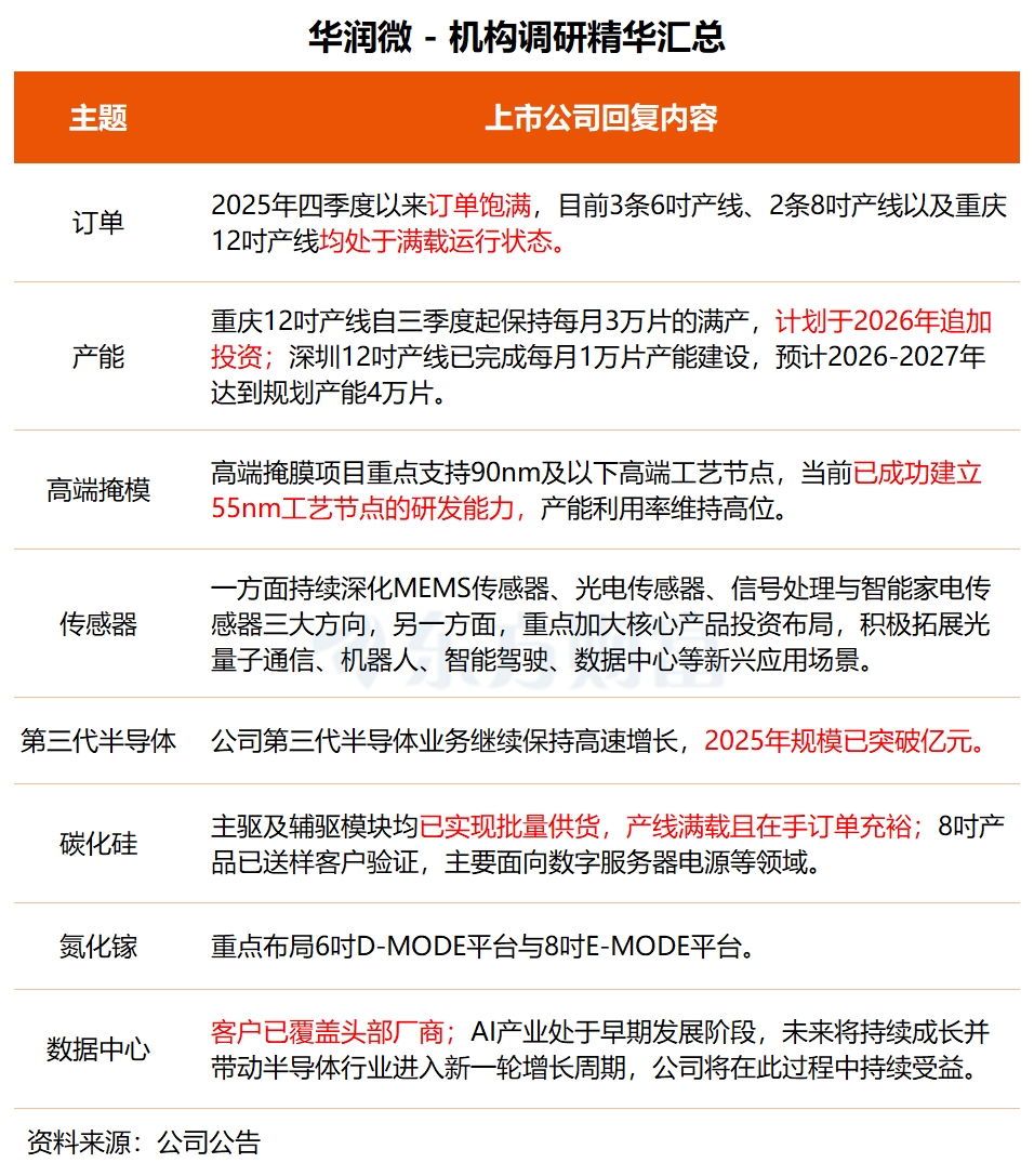 华润微近期接受广发证券、富国基金等多家机构调研。公司在交流中透露,2025年四季度以来,公司订单饱满,目前3条6吋产线、2条8吋产线以及重庆12吋产线均处于满载运行状态。