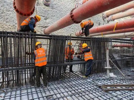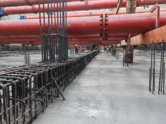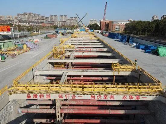 底板施工过程中,严格执行“分层分段、对称浇筑”原则,引入可视化信息管理平台,对钢筋直螺纹机械连接、混凝土浇筑等关键工序实施全程监控。针对大跨度无柱拱形顶车站结构特点,运用无线智能伺服系统控制钢支撑应力变化,有效规避软土变形风险,形成可复用的“软土深基坑精细化管控技术”。所有底板混凝土浇筑均连续作业,项目部优化上翻梁浇筑方案,大幅缩短单块底板施工时间,用时28天完成底板封底,为后续站厅、站台等上层结构施工创造了有利条件。