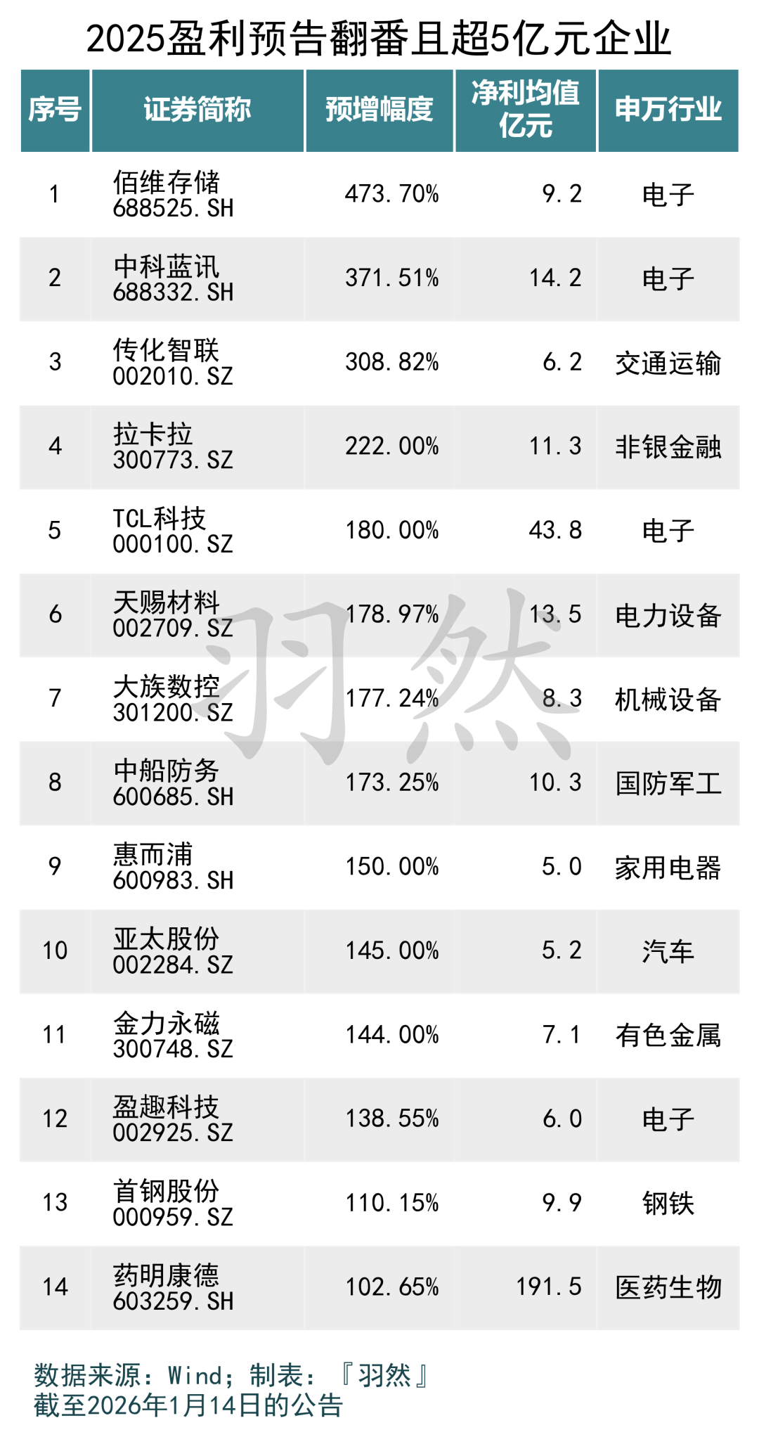 此外,共有14家企业不仅盈利翻番,且净利润规模超过5亿元,其中佰维存储、中科蓝讯、传化智联、拉卡拉和TCL科技增幅最为突出。
