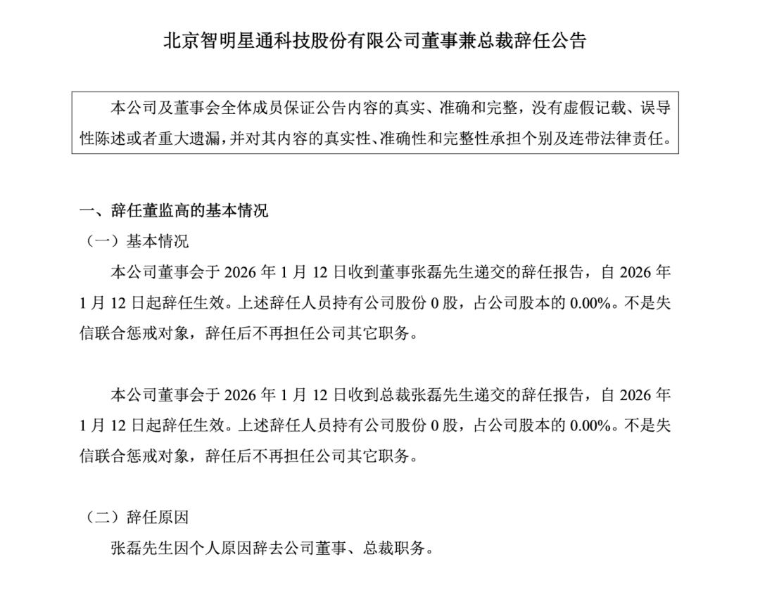 1月14日晚间,北京老牌游戏厂商智明星通公告称,公司董事兼总裁张磊因个人原因于2026年1月12日辞去公司董事及总裁职务,辞任自当日起生效。