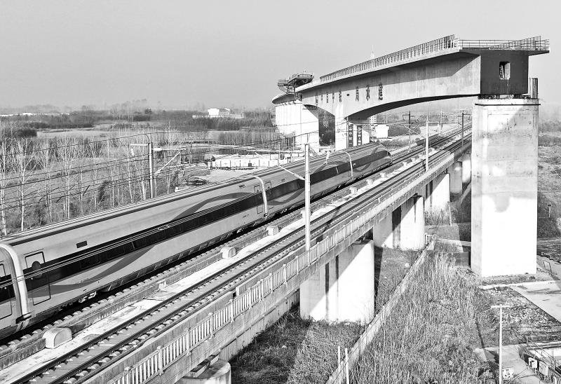 1月16日,行驶在京沪高铁线上的列车穿过沪宁合高铁跨京沪高铁立交特大桥201.5米预应力混凝土T构转体梁(无人机照片)。