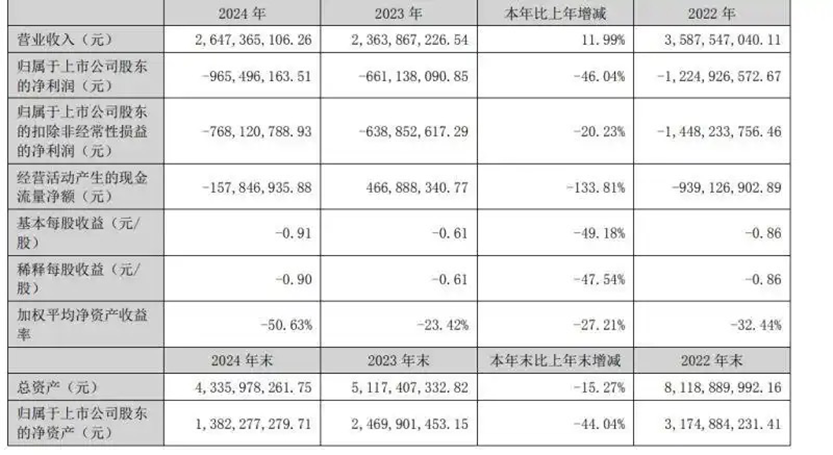 此外,在这三年时间里,扣除非经常性损益后的归母净利润均处于亏损状态,2022年亏损14.48亿元,2023年亏损6.39亿元,2024年亏损7.68亿元,累计起来三年亏损额超28亿元。