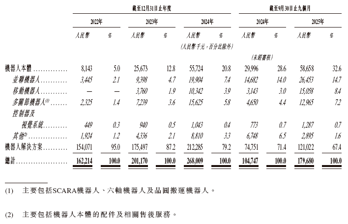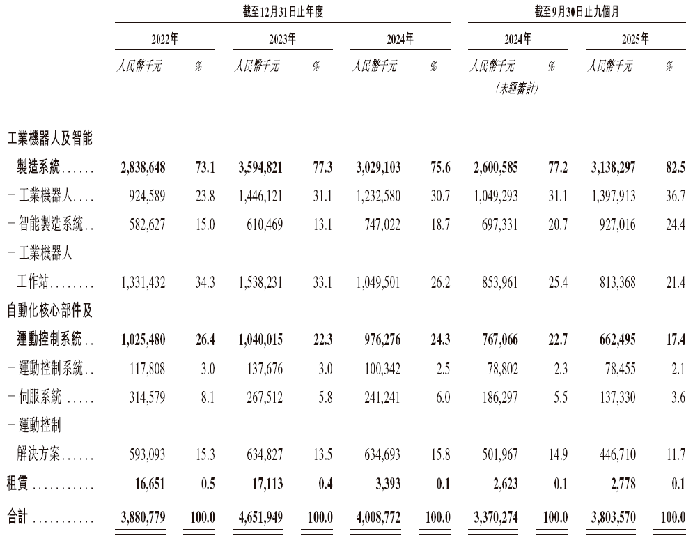 作为核心板块之一工业机器人及智能制造系统,2022-2024 年,该板块收入在为28.38,648千元、3,594,821千元、3,029,103千元;2025 年前九个月,该业务收入达 3,138,297千元,收入占比进一步提升。