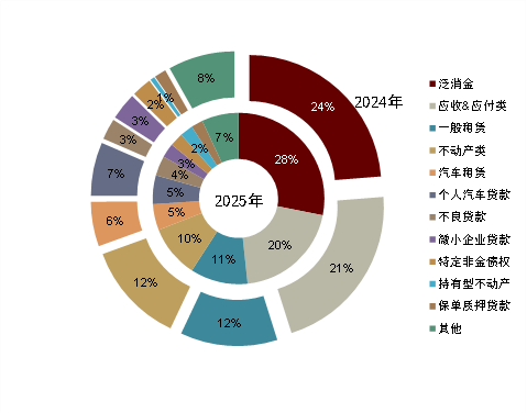 非标市场热度略减。2025年银登中心转让ABS共计1056亿元,129单,分别同比-14%、+18%,资产类型以对公贷款和车贷为主。此外,不良类资产转让规模206亿元,占比约二成,以信用卡不良为主。保交所注册ABS共计3635亿元,96单,分别同比-13%、-7%。