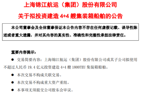 12月26日晚间,上海锦江航运(集团)股份有限公司(下称 “锦江航运”)宣布拟投资不超过 19.4 亿元建造 8 艘 1800TEU 集装箱船。