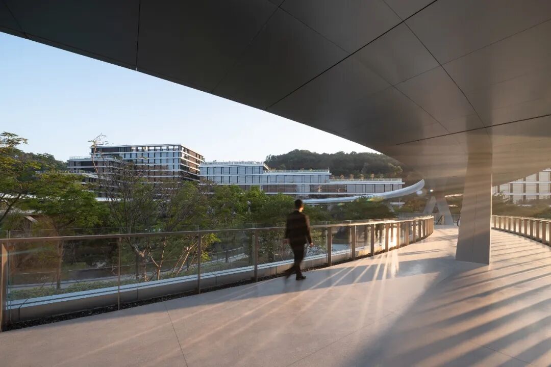 “云廊”兼具风雨连廊与空中跑道的复合属性,使日常通行不再只是功能行为,而成为园区中最具活力的公共界面。它连接的不只是建筑,更连接着工作、休息与社交的连续日常。