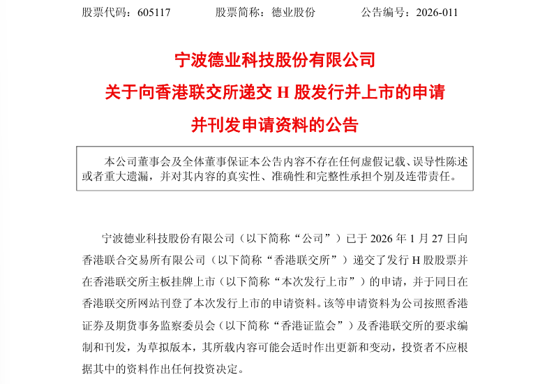 公告显示,德业股份于2026年1月27日向香港联合交易所有限公司递交了发行H股股票并在香港联交所主板挂牌上市的申请,并于同日在香港联交所网站刊登了本次发行上市的申请资料。资料显示: