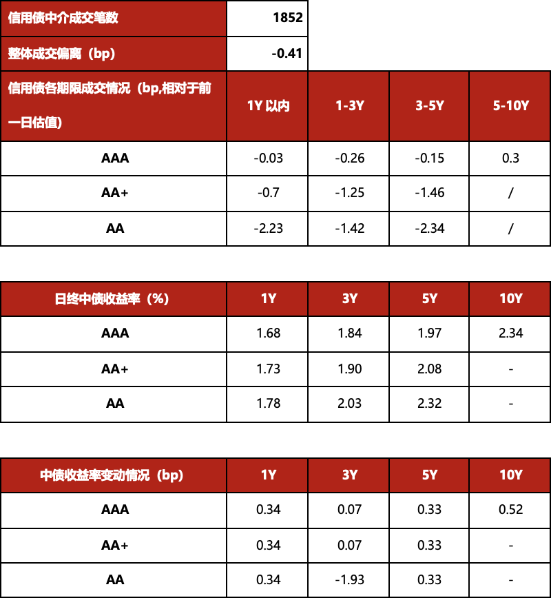 信用债二级方面受利率行情压制,稍有走弱。成交笔数进一步回落但仍维持在活跃分位水平,整体看低估值成交,但偏离幅度收窄。1Y内短券成交抬升,整体围绕估值谈成,3-5Y期成交进一步放量,成交分位达96分位水平,bid给价收敛,成交低估值偏离较昨日收窄,更长期则成交寡淡,整体略高估值谈成。