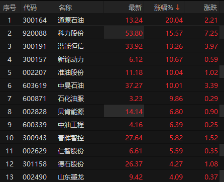 上证报中国证券网讯 1月29日午后,油气股再度拉升,截至13时14分,通源石油20cm涨停,准油股份、石化油服、中曼石油涨停,潜能恒信、新锦动力涨超10%,贝肯能源、中油工程等跟涨。