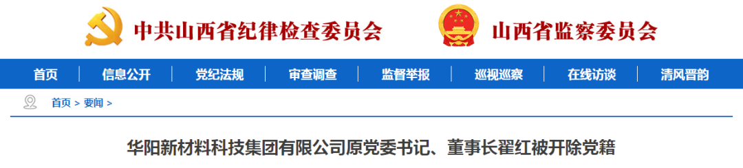 日前,经省委批准,省纪委监委对华阳新材料科技集团有限公司原党委书记、董事长翟红严重违纪违法问题进行了立案审查调查。
