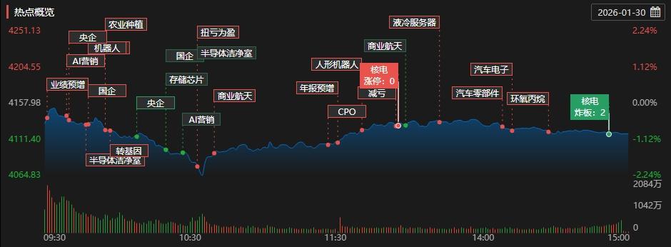盘面上,光纤、光模块等算力硬件股午后走强,长飞光纤(601869)、天孚通信(300394)等股创历史新高,海外算力数据中心对新型光纤光缆产品需求高增。国际粮价上涨催化,多只粮食概念股走高,登海种业(002041)、敦煌种业(600354)等股涨停。同样受涨价催化的环氧丙烷板块同步拉升,红宝丽(002165)尾盘涨停。此外,旅游、影视院线、煤炭等板块表现活跃。另一方面,国际金银价格大跳水,黄金股大幅回调,晓程科技(300139)、中金黄金(600489)、赤峰黄金(600988)多股封住跌停。部分油气资源股同样跟随回调,潜能恒信(300191)、贝肯能源(002828)、海油发展(600968)领跌。白酒、房地产板块未能延续涨势,洋河股份(002304)尾盘跌超7%。