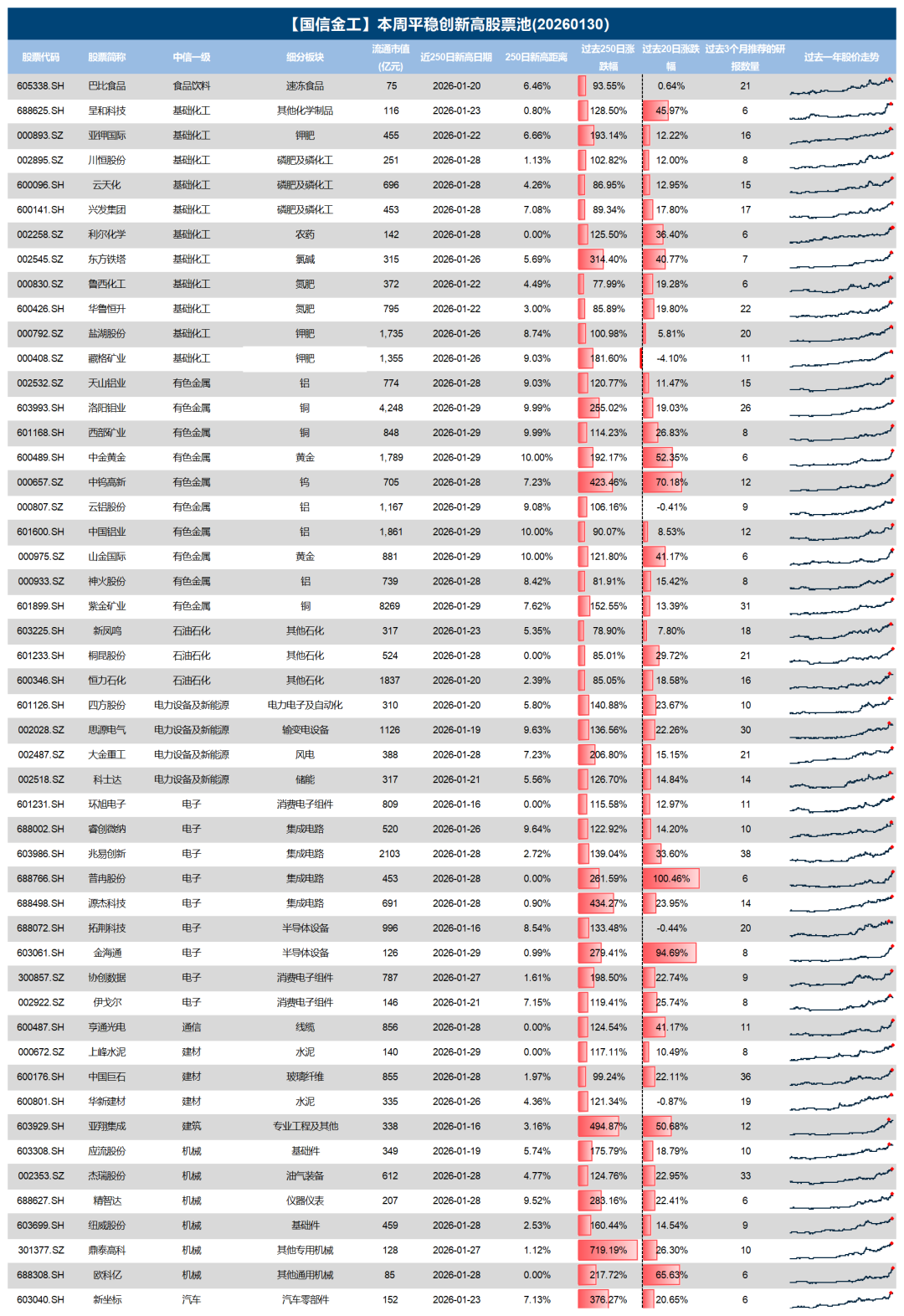 我们在上市满15个月的股票池内,筛选出过去20个交易日创出过250日新高的股票。截至2026年1月30日,共1606只股票在过去20个交易日间创出250日新高。其中创新高个股数量最多的是机械、电子、基础化工行业,分别有238、188、177只。创新高个股数量占比最高的是有色金属、国防军工、石油石化行业,占比分别为70.73%、63.11%、62.75%。