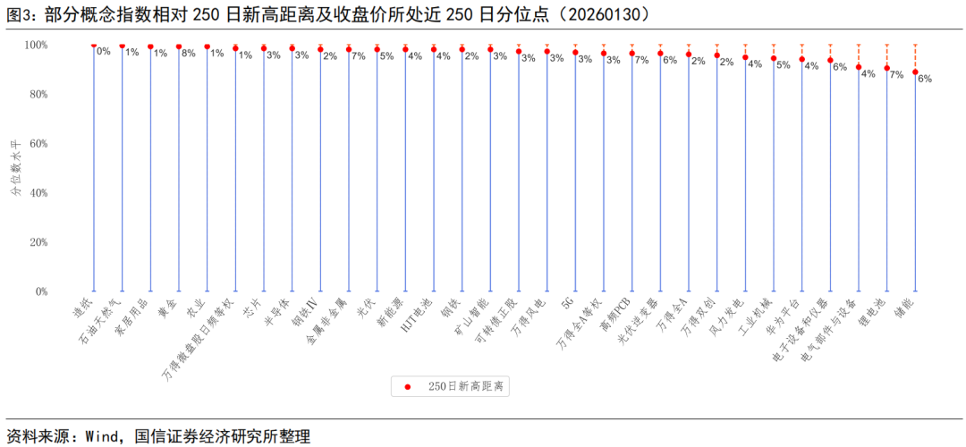 截至2026年1月30日,上证指数、深证成指、沪深300、中证500、中证1000、中证2000、创业板指、科创50指数250日新高距离分别为1.14%、1.62%、1.76%、2.68%、2.55%、3.34%、1.24%、2.99%。中信一级行业指数中通信、石油石化、建材、有色金属、轻工制造行业指数距离250日新高较近,食品饮料、银行、综合金融、医药、综合行业指数距离250日新高较远。概念指数中,造纸、石油天然气、家居用品、黄金、农业、万得微盘股日频等权、芯片等概念指数距离250日新高较近。