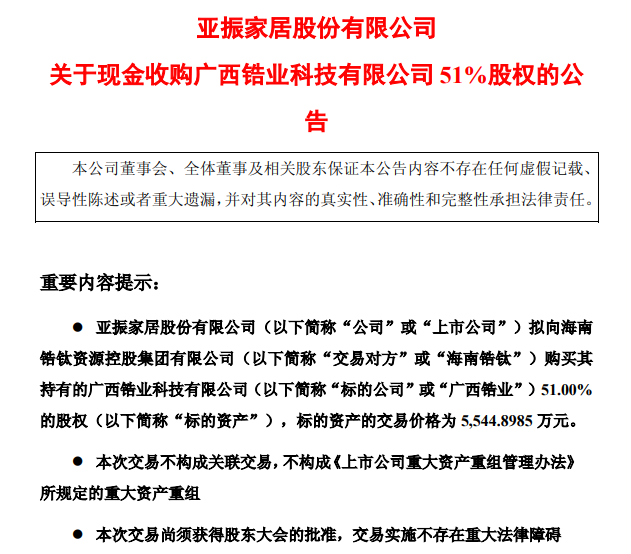 2025年4月,全球最大锆钛矿开采企业之一济南域潇集团实控人吴涛入主,其雄厚的矿产资源与资本实力,让市场对资产注入、重组乃至借壳上市充满想象,极大提振了投资者信心。同年8月,亚振家居以5544.9万元收购广西锆业51%股权,正式切入锆钛矿这一战略性新兴产业。该领域应用于航空航天、新能源等高端场景,稀缺性突出,为公司打开全新增长空间。