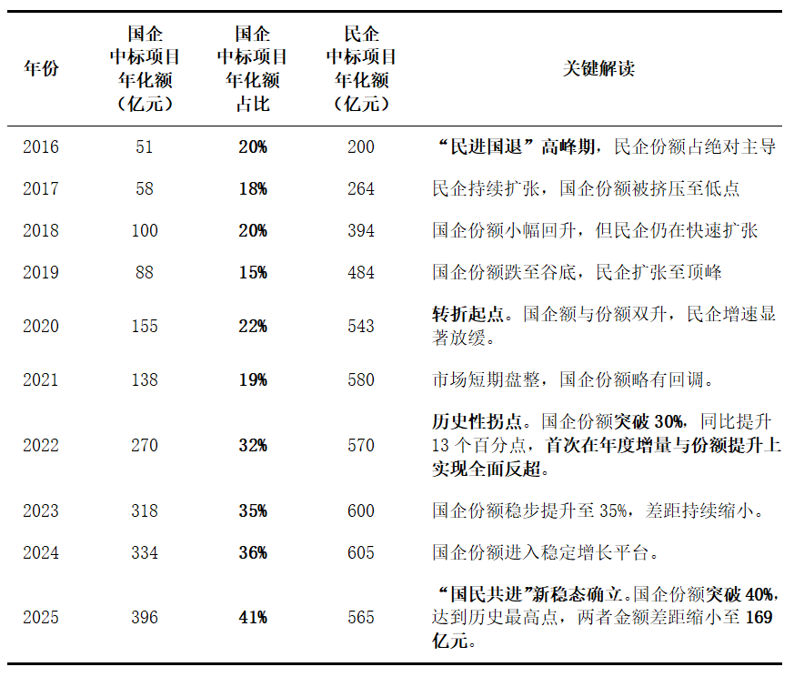 重构期(2023-2025):市场进入“国民共进”新稳态。国企份额从35%稳步攀升至41%,在增量市场和规则定义上占据主动;民企转向存量精耕。两者战略角色清晰化,从“替代竞争”走向“错位共生”。