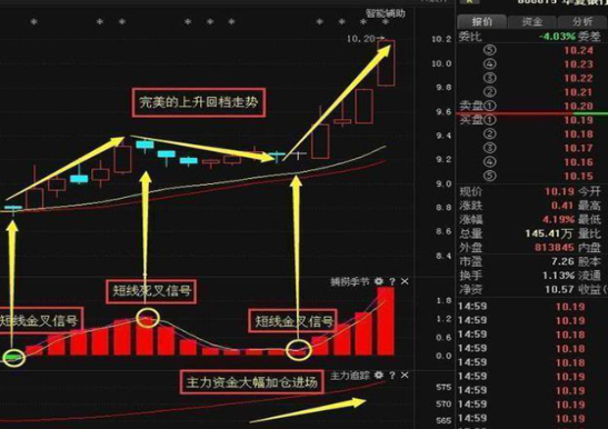 华夏银行这个就是完美的上升回档走势,捕捞季节短线金叉一出股价就会上升一波,当短线死叉一出股价就开始回调,股价回调到智能辅助线附近捕捞季节出金叉信号,股价又开启一波拉升,由于主力资金一直加仓进场才会有这么完美的上升回档走势!