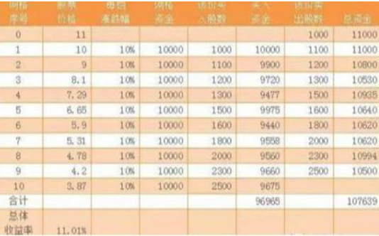 第二步:买入股票。按照网格交易操作,从起始价位开始,价格每下跌一格,就买入相应的资金量。但因为A股有整数买的限制,所以该价格只能买到整数的数量,使用大部分的资金。以表格为例,10元开始,买入1000股,10元跌到9元,买入1100股,9月跌倒8.1元,买入1200股,以此类推。