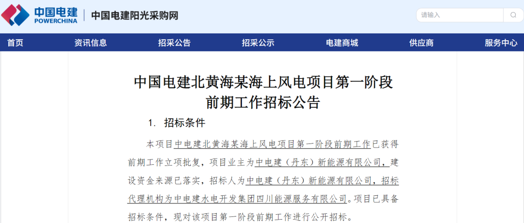 2月2日,中国电建阳光采购网发布《中国电建北黄海某海上风电项目第一阶段前期工作公开招标公告》。