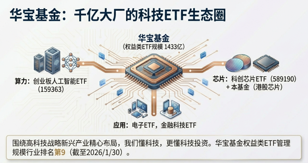 华宝基金通过围绕高科技战略新兴产业方向持续投入和精心布局,目前已形成了覆盖算力、大模型、应用的AI产业链ETF矩阵,其主力产品包括聚焦海外算力主题的双创赛道规模最大、流动性最佳人工智能ETF——创业板人工智能ETF华宝(159363),聚集港股芯片产业链的全市场首只港股信息技术ETF(159131)、布局科创板芯片产业链的科创芯片ETF华宝(589190)、覆盖国产算力主题的科创人工智能ETF、大数据ETF华宝、智能制造ETF、信创ETF基金等,主投大模型主题的港股互联网ETF、覆盖AI应用的电子ETF、金融科技ETF、通用航空ETF华宝、港股通汽车ETF华宝等产品。