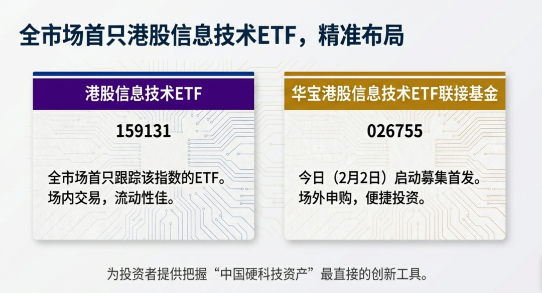 千亿规模ETF大厂——华宝基金今日(2月2日)启动聚焦“港股芯片”产业链的全市场首只港股信息技术ETF联接基金(026755)募集首发,港股信息技术ETF(159131)为全市场首只跟踪中证港股通信息技术综合指数(简称“港股通信息C”)的ETF产品,其标的指数由属于信息技术产业的42只港股硬科技公司构成成份股组合。该基金将为场外投资者参与把握港股“中国硬科技资产”投资机遇提供又一创新基金工具。