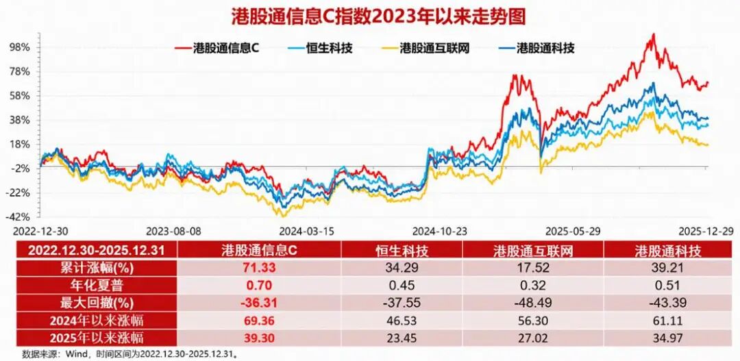 近年来,以芯片技术为龙头的国内硬科技产业的跨越式发展,亦有力支撑了港股通信息C指数的市场表现。2022.12.30至2025.12.31期间,港股通信息C指数累计涨幅达71.33%,显著超越恒生科技、港股通互联网、港股通科技等港股科技类指数同期34.29%、17.52%、39.21%的涨幅表现;港股通信息C指数同期内最大回撤为-36.31%,亦优于恒生科技、港股通互联网、港股通科技等指数同期-37.55%、-48.49%、-43.39%的最大回撤。