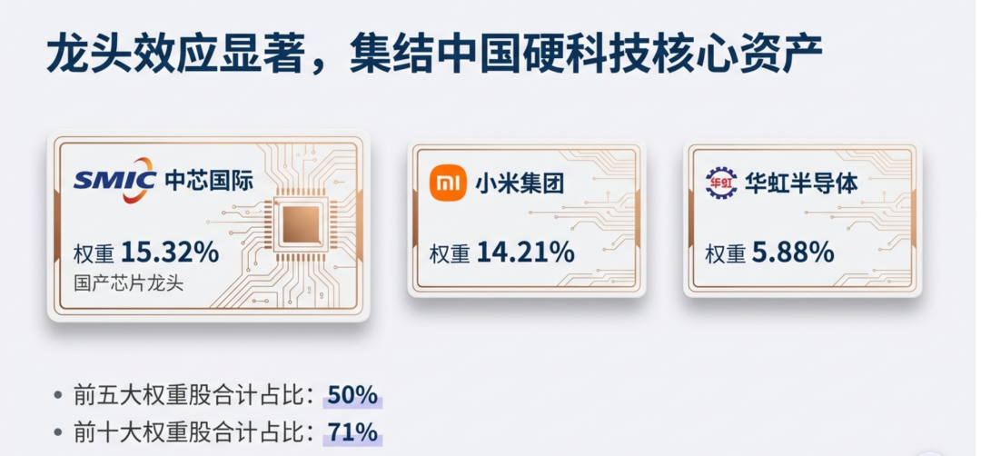 截至2025年12月末,港股通信息C指数成份股涵盖42只港股硬科技公司,其中国产芯片龙头——中芯国际权重占比达15.32%,小米集团权重占比14.21%,华虹半导体权重占比5.88%;该指数前五大权重股合计占比50%,前十大权重股合计占比71%,其龙头股权重集中度高,更加契合科技产业龙头效应客观规律,适合捕捉龙头公司长期增长机遇。