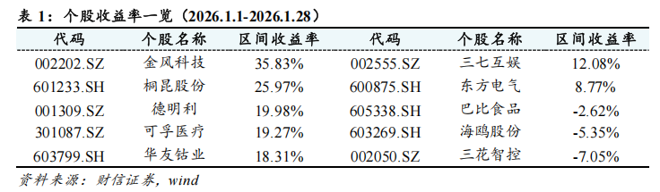2026年1月份十大金股收益情况。2026年1月份财信证券十大金股深耕基本面,同时把握市场主题,2026年1月1日建仓起,截至2026年1月28日(下同),2026年1月份财信证券十大金股累计上涨12.54%,跑赢同期沪深300基准指数10.64个百分点。其中,收益率排名前三的个股分别为金风科技、桐昆股份、德明利,收益率分别为35.83%、25.97%、19.98%,其中:金风科技主要受益于商业航天概念,上半月取得较大涨幅,下半月由于主题炒作降温,出现不小幅度回撤,但仍有较为丰厚的收益;桐昆股份主要受益于行业景气度回升预期,以及资源类周期股的整体上行,实现了较高收益率;德明利主要受益于存储芯片涨价趋势,也取得近20%收益率。