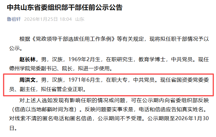 2026年1月25日,山东省委组织部发布干部任前公示公告,其中“周洪文,男,汉族,1971年6月生,在职大专,中共党员。现任省国资委党委委员、副主任,拟任省管企业正职。”
