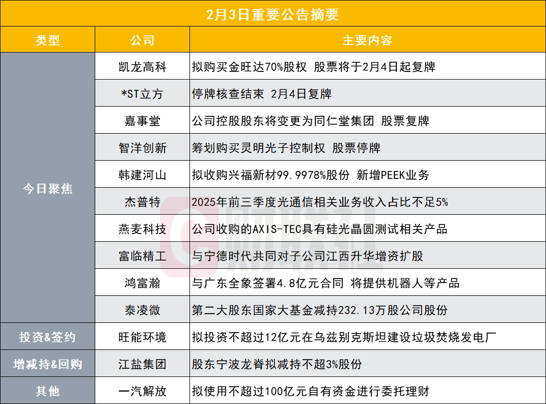 【凯龙高科:拟购买金旺达70%股权 股票将于2月4日起复牌】