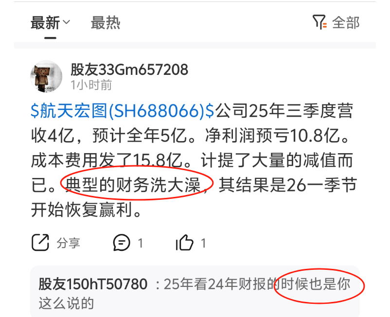 关于业绩亏损,也有股民认为这是“典型的财务洗大澡”,不过该观点也遭遇了其他股民的呛声。
