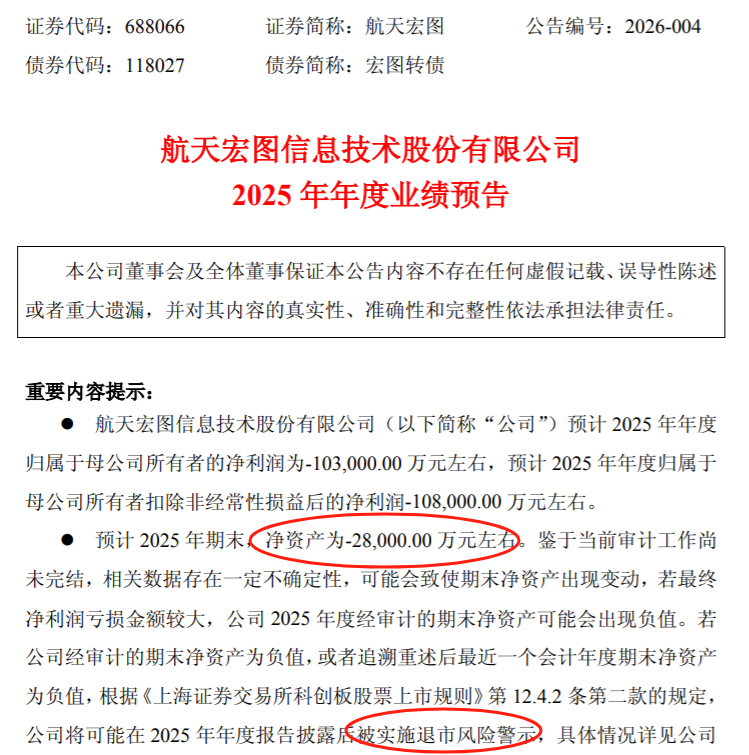 1月31日,上市公司航天宏图发布全年业绩预告,公司预计2025年度归母净利润为-10.3亿元左右;预计扣非后归母净利润为-10.8亿元左右;预计2025年期末净资产为-2.8亿元左右。