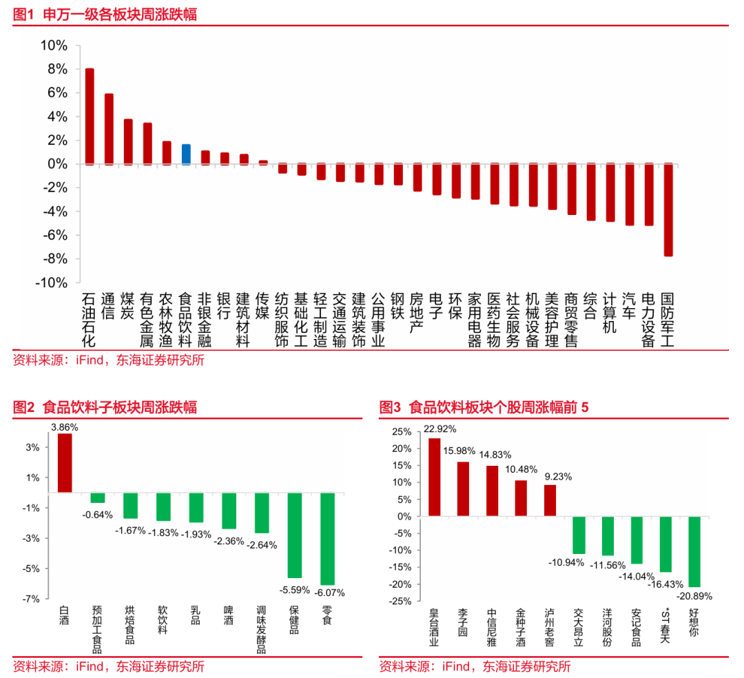 二级市场表现:白酒板块表现较好。上周食品饮料板块上涨1.56%,跑赢沪深300指数1.48个百分点,食品饮料板块在31个申万一级板块中排名第6位。子板块方面,上周白酒表现较好,上涨3.86%。个股方面,上周涨幅前五为皇台酒业、李子园、中信尼雅、金种子酒、泸州老窖,分别为22.92%、15.98%、14.83%、10.48%、9.23%。