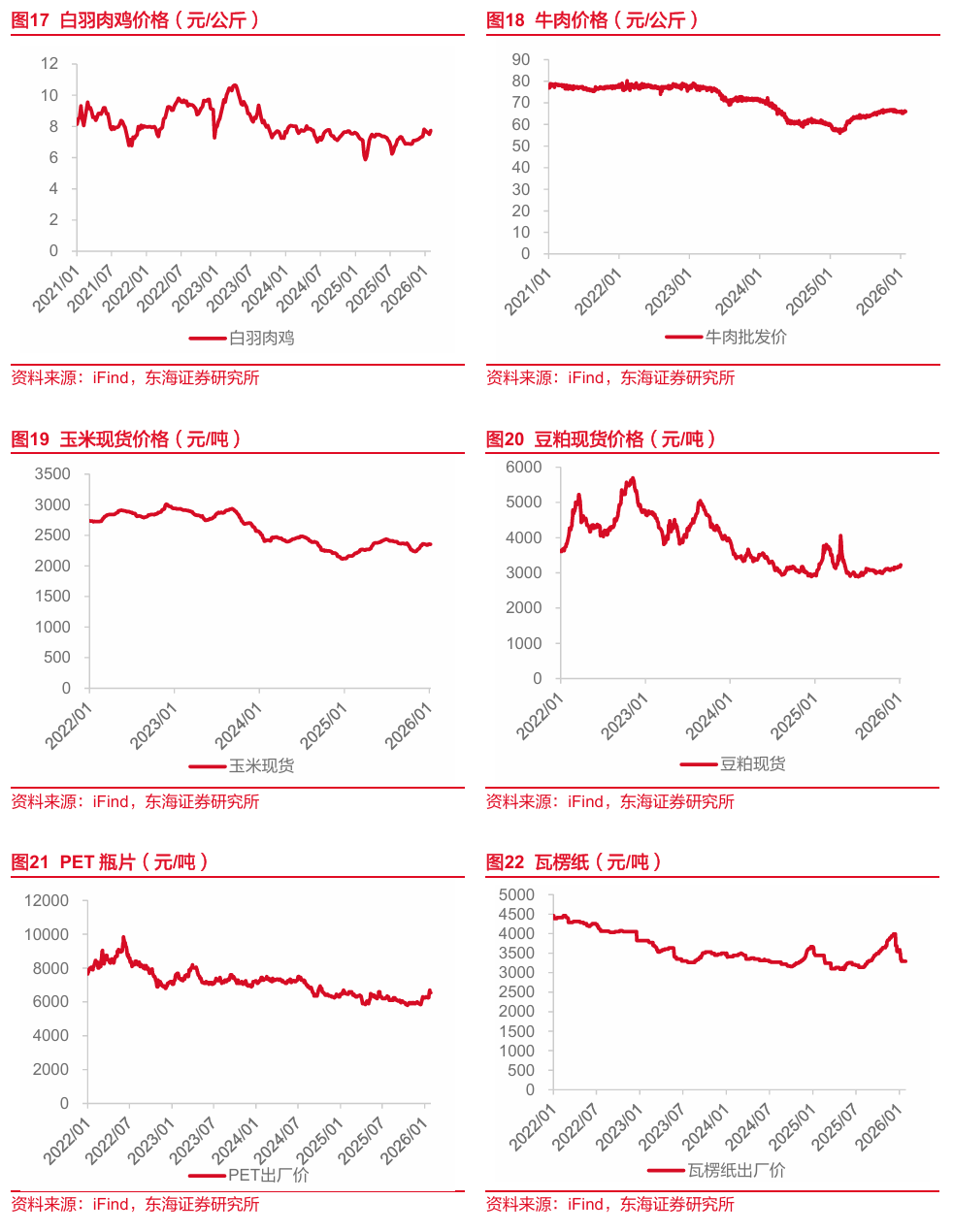 农产品价格:截至2026年1月30日,玉米2376.27元/吨,周环比+0.07%,同比+10.00%;豆粕3197.14元/吨,周环比+0.09%,同比-1.64%。