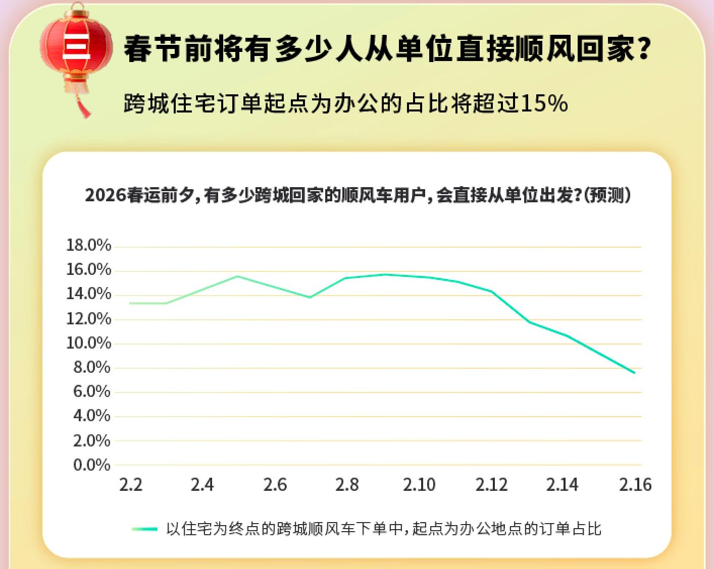 此外,今年春节前夕,在以住宅为终点的跨城顺风车下单中,预计将有超15%是直接从单位出发,一站直达到家。顺风车让春节前还在坚守岗位的上班族,回家更省心和高效。