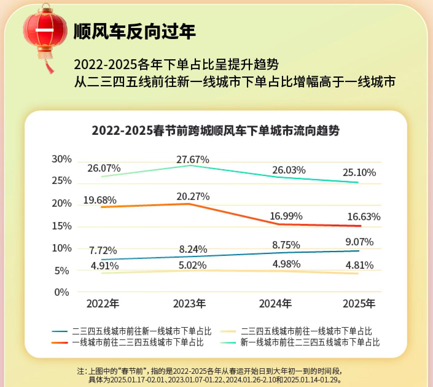 从2022年至2025年,各年春节前的跨城顺风车城市流向来看,从一线新一线城市分别前往二、三、四、五、线城市的下单量占比,整体均呈下降趋势,且一线城市前往二三四五线城市下单占比降幅更明显,从2022年的19.68%降至2025年的16.63%,下降超3个百分点。
