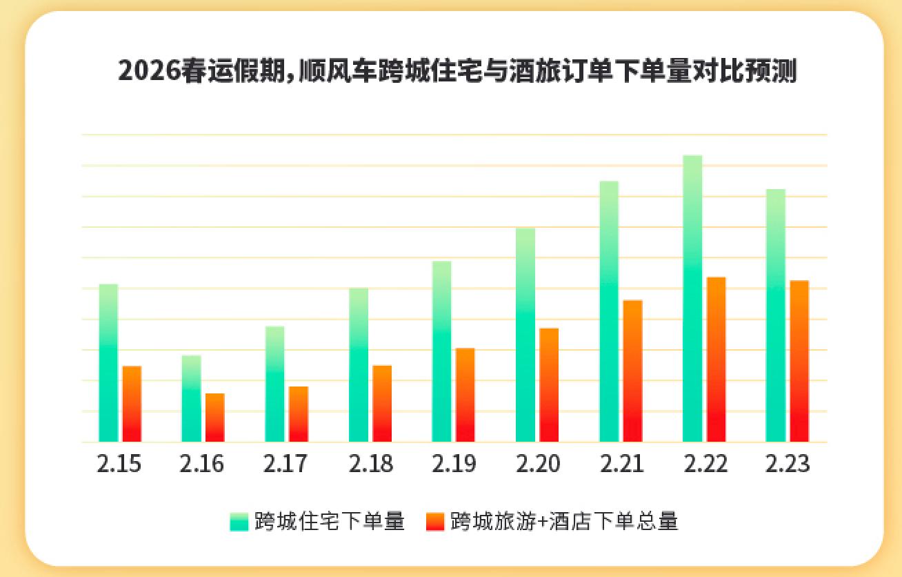 《预测》显示,今年春节假期期间,跨城顺风车酒店下单和旅游下单的峰值均将出现在2月22日(大年初六),同时,酒店及旅游下单从2月21日(大年初五)至2月25日(大年初九)均将持续高位。