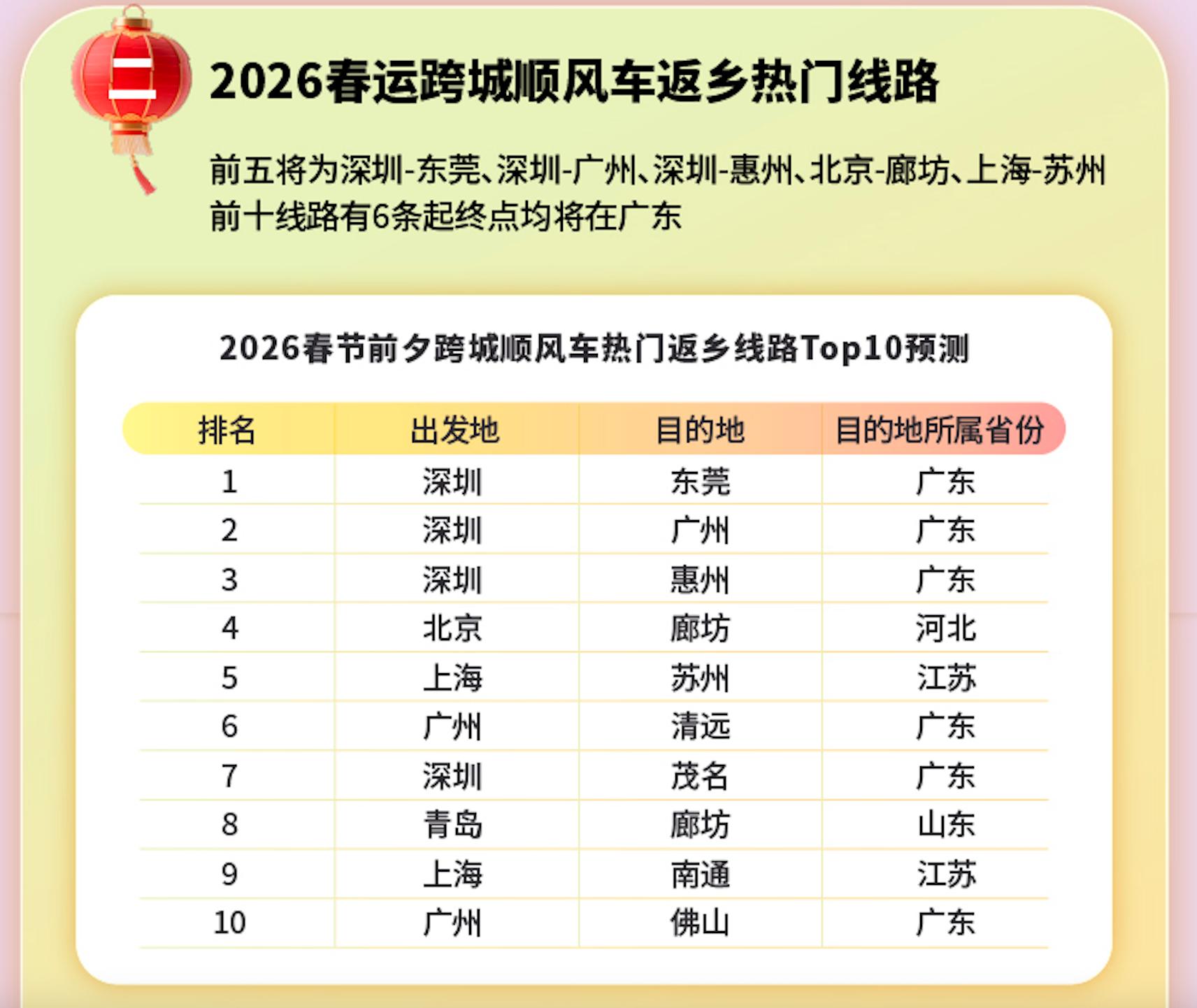 此外,从跨城顺风车返乡热门目的地城市来看,前十将包括广州、深圳、东莞、上海、苏州、佛山、惠州、杭州、北京、成都。
