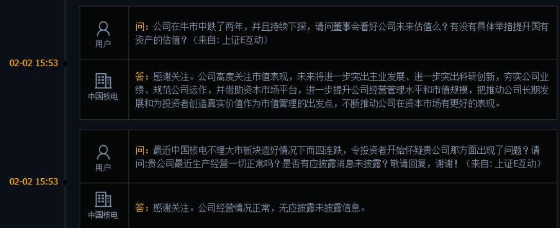 而中国核电股价的疲弱走势,也引起投资者的疑问。有投资者在上证E互动上询问“公司在牛市中跌了两年,并且持续下探,请问董事会看好公司未来估值么?有没有具体举措提升国有资产的估值?”也有投资者怀疑公司哪方面出现了问题。