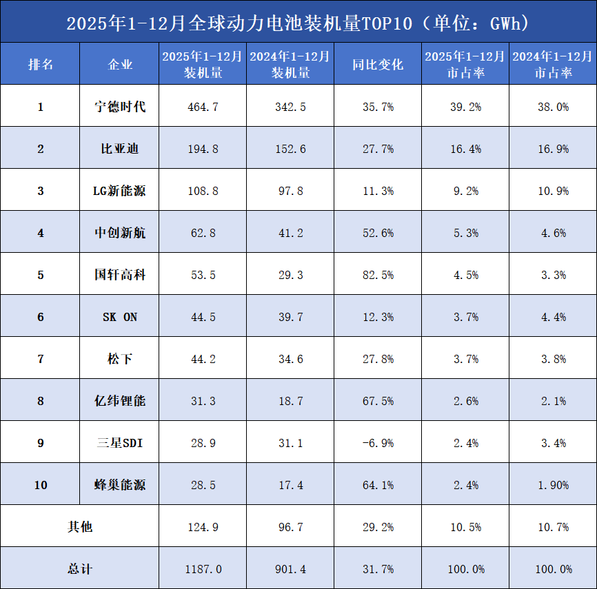 据SNE最新统计数据显示,2025年1-12月,全球电动汽车电池装车量达1187GWh,同比增长31.7%。
