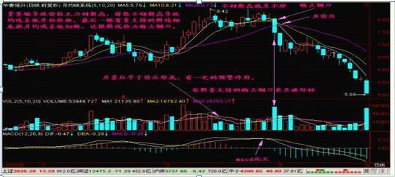 当股价在高位盘整后渐渐下滑,此时5日、10日和20日均线形成的均线系统呈现收敛状态。此时如出现一根阴线跌破三条均线形成一阴断三线的“断头铡刀”,则应警惕有一轮跌势。特别是带有较大成交量的阴线,则更有下跌的可能。见(下图)